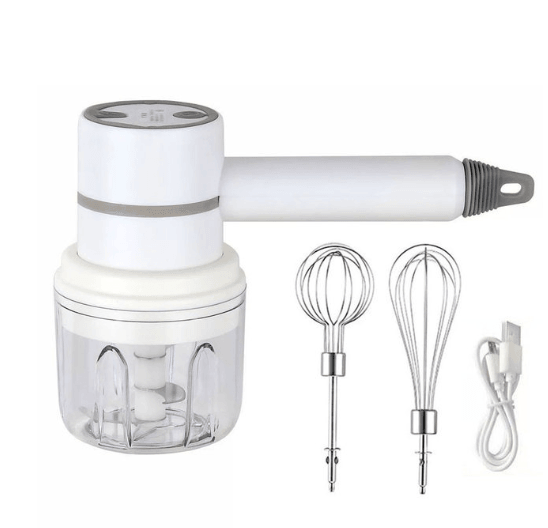 O Mini Batedor 3 em 1 funciona com apenas um clique. Versátil, é mixer, processador e batedor de massas leves, trocando apenas o acessório.